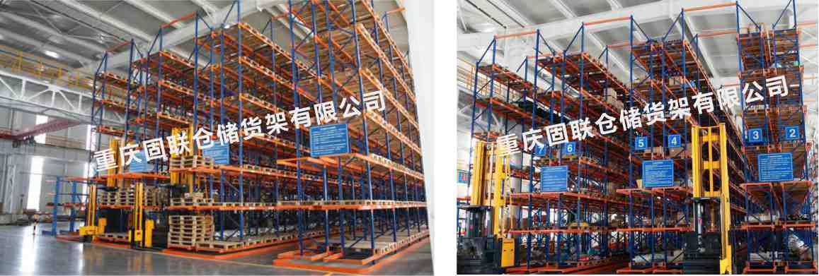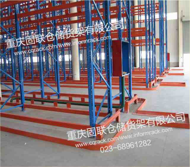 窄巷式貨架安裝后有高約200MM的導軌(導軌可在土建時做好,也可在安裝貨架時用做好的護板做)做為叉車的引導系統(tǒng),減少叉車司機因人為因素對貨架產生的危險。