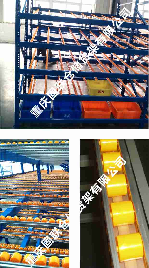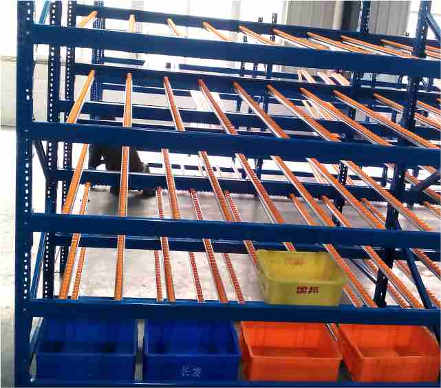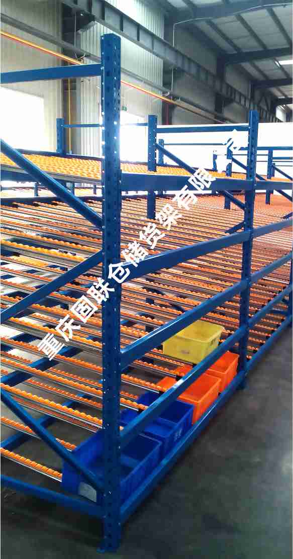 滾輪式料架簡稱流利架,是將貨物置于滾輪上,利用一邊通道存貨,另一邊通道取貨。料架朝出貨方向向下傾斜,貨物在重力作用下向下滑動。可實現先進先出,并可實現一次補貨,多次揀貨。流利架存儲效率高,適合大量貨物的短期存放。
